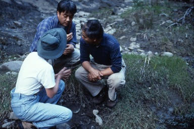 Shigeru Nakano explaining to Masahiko Higashi and Mary Power that heptageniids are often collector-gatherers, Eel River, 2000.