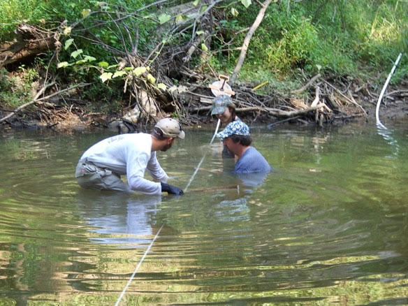 Quantifying submerged wood in the Cache River, southern Illinois. From left to right: K. Heinrich, E. Scholl, M. Whiles. The Cache River management and restoration project was a 15-year long collaboration among state and federal resource managers, non-government organizations, local landowners, and academic scientists.