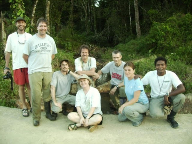 The Tropical Amphibian Declines in Streams (TADS) project 15N release group at Rio Maria near El Valle de Anton, Panama'. From left to right: R. Hall, M. Whiles, S. Connelly, A. Huryn, C. Pringle, P. Vierburg, H. Ross, E. Griffith. Photo by W. K. Dodds. This group did a LINX style 15N release in the stream in 2008 before a chytrid fungus disease wave hit the region, and then another release in 2010 after the amphibian decline had occurred.