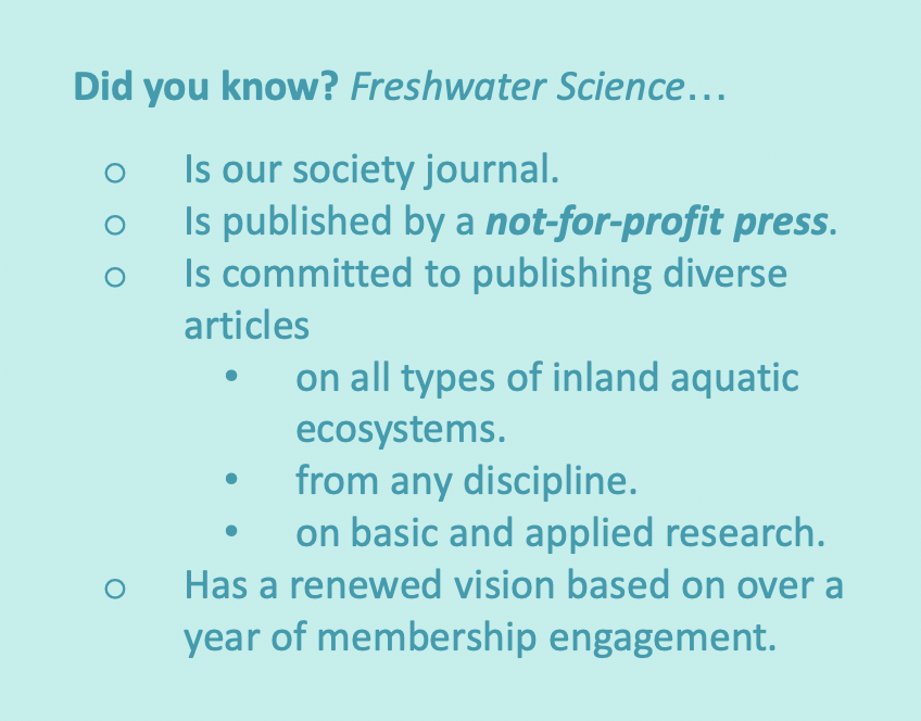 Our non-profit society journal is a great venue to publish your work. Our Endowed Publication Fund also can provide assistance with costs associated with publication in Freshwater Science.